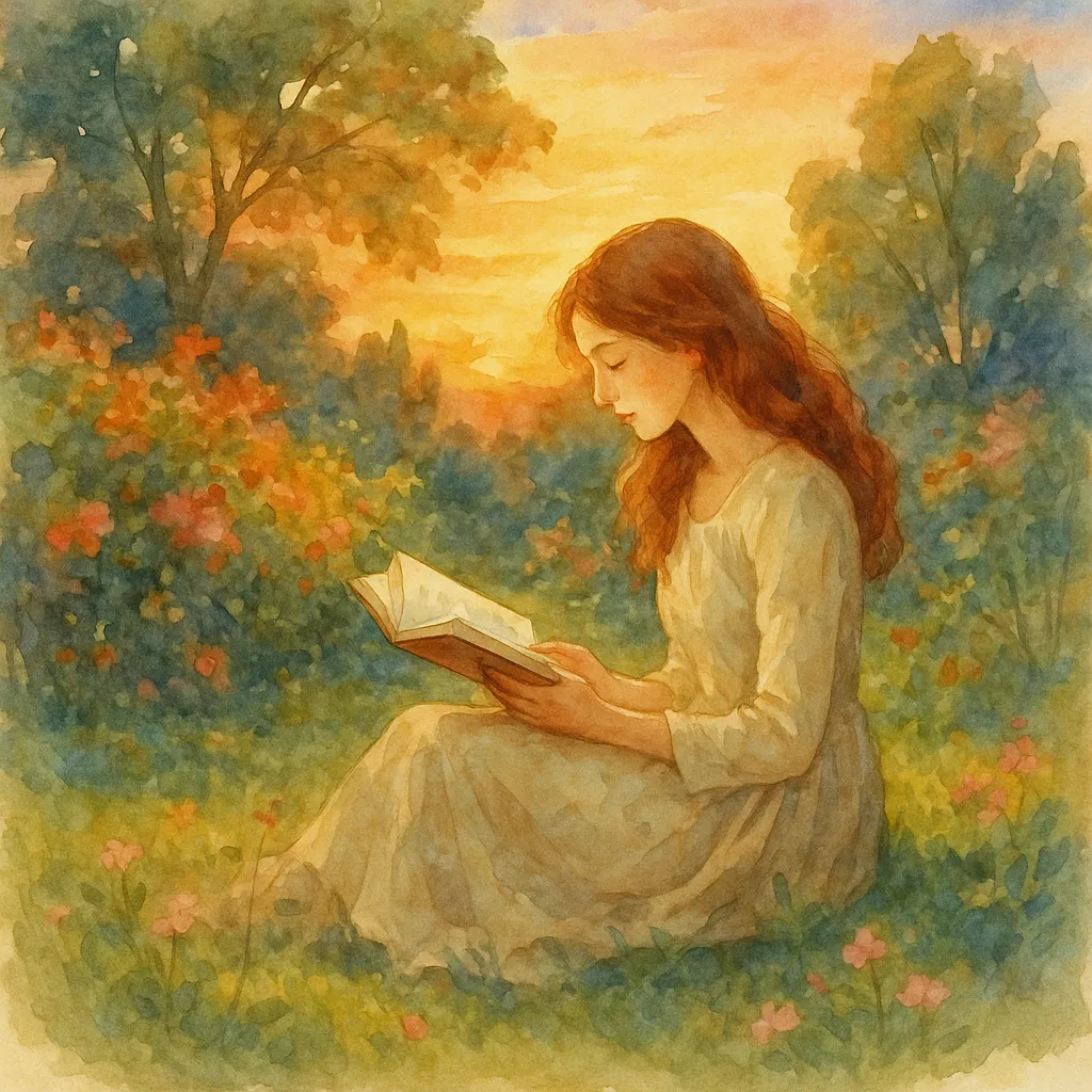 “una escena de una mujer leyendo bajo un árbol, estilo acuarela”.