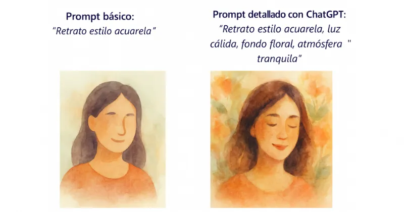 Por ejemplo: “Escribe un prompt para un retrato futurista en acuarela con colores suaves y fondo urbano.”